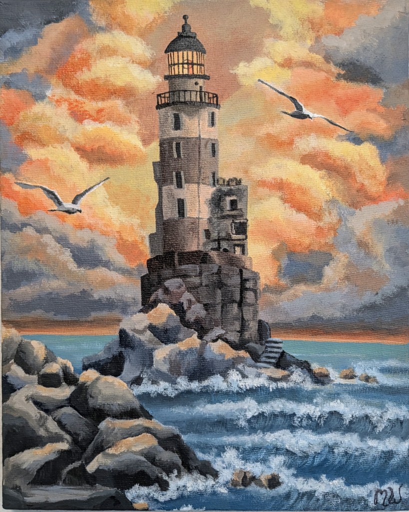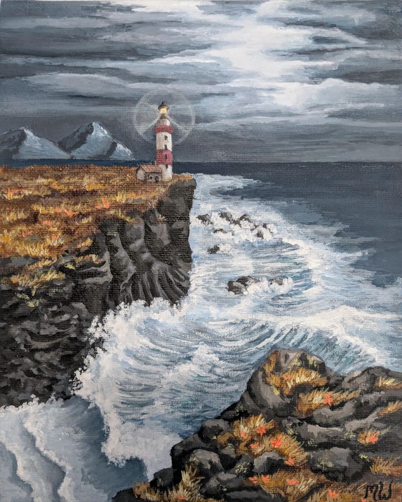 I was inspired by this Picture on Pinterest: I imagined a lighthouse standing on the cliff shining through the overcast sky and stormy sea; a light of hope.